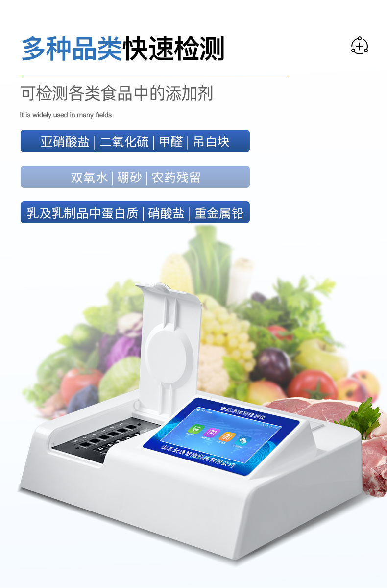 1、檢測項目:可快速檢測各類食品中的甲醛、二氧化硫、亞硝酸鹽、吊白塊、農藥殘留的含量,儀器預留其他項目檢測程序和端口,根據日后需求可方便的自主增加檢測項目。